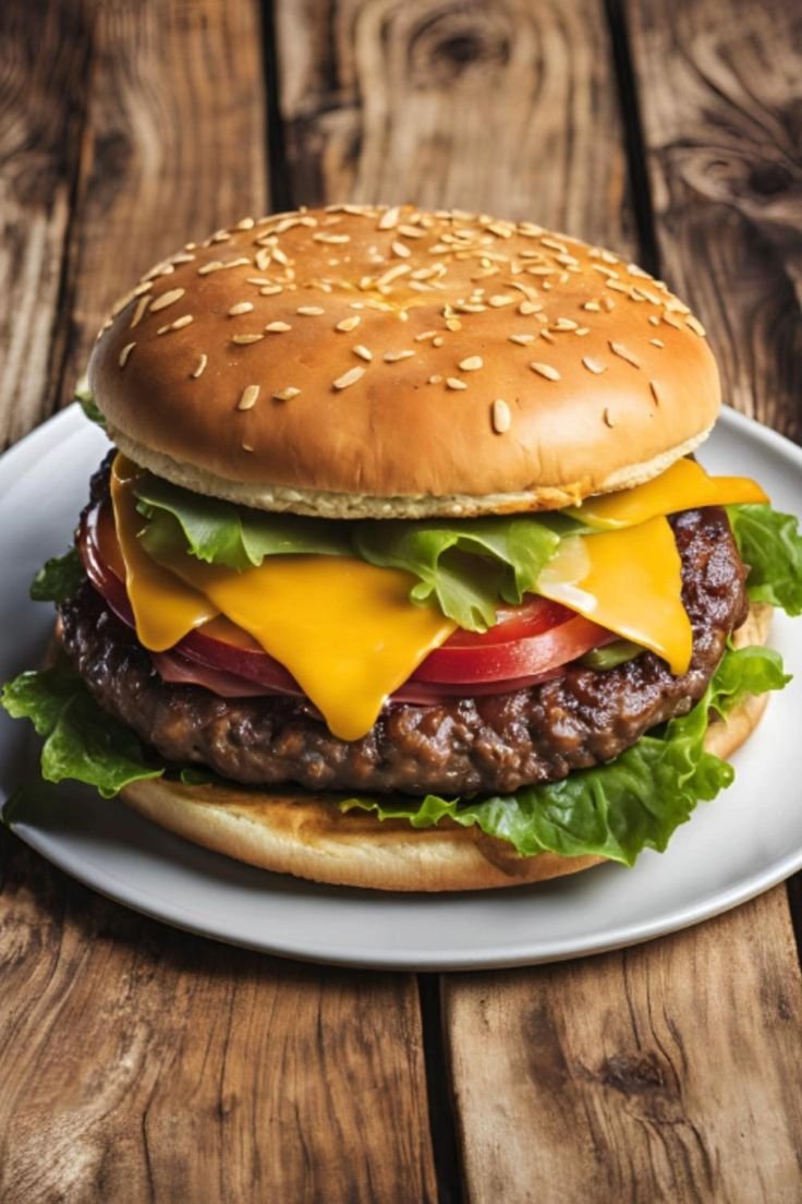 Un sandwich composé de viande hachée grillée, accompagnée de légumes frais et de salade, servi dans un pain moelleux ou croustillant.