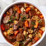 Le bœuf bourguignon est un ragoût français à base de viande de bœuf mijotée dans du vin rouge, avec des légumes, des lardons et des herbes, pour un plat savoureux et réconfortant.